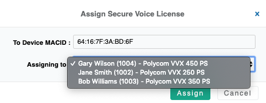 From here, you can choose an unassigned Secure Voice service and assign it to a device. You can also unassign one that is currently assigned. The list of devices available for assignment will only include Poly x50 devices. Once assigned, the phone may reboot to apply the encryption.