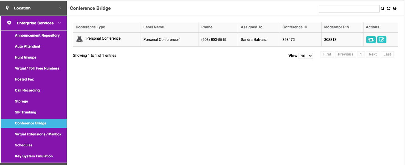 In the Customer Administration Portal, there is a section under Enterprise Services that will reveal all the details about any audio conference bridge in the PBX.