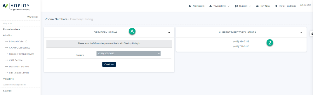 - Select the number you want to register with a Directory Listing from the dropdown and select continue.