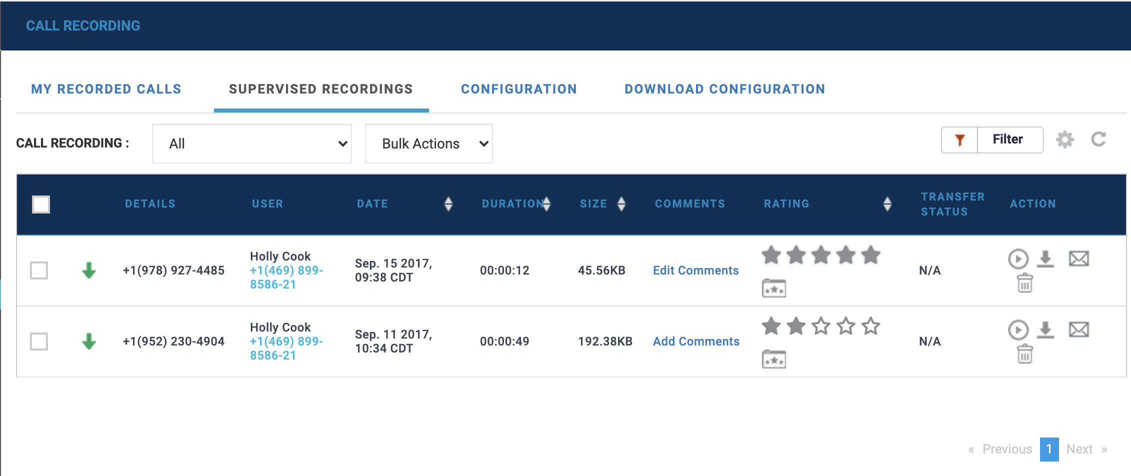 - The following information will be displayed for each file: Assigned DID or Phone Number, User (You), Call Details (Direction of Call, Other User Details), Date and Time when the call was recorded, Duration of recorded call, Size, Annotations (if applicable): These are comments as provided by your supervisor(s) for the specific recording; Ratings (if applicable): This is the rating provided by your supervisor for this specific recording