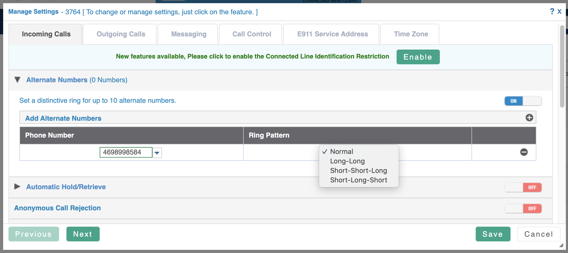 Assigning distinctive rings for alternate numbers in the Customer Administration Portal