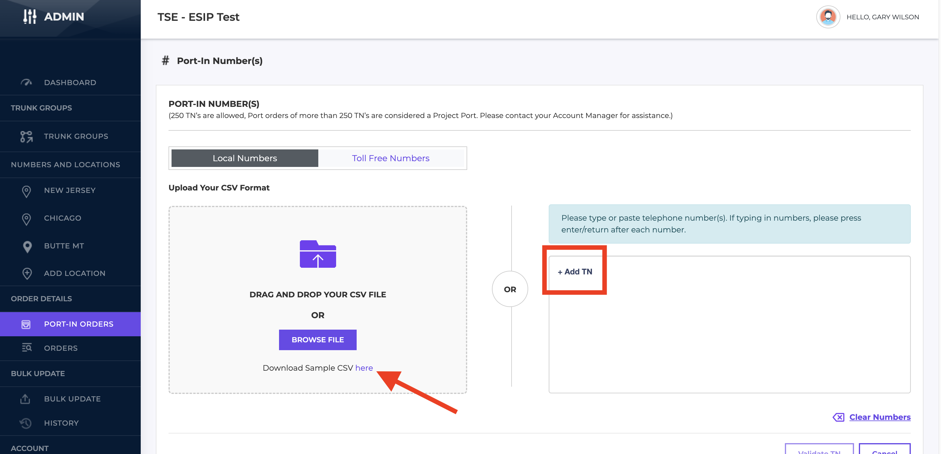 On the first screen, enter the numbers that you wish to port. You have several ways to enter the numbers depending on how many. If you have a few, you can just type in the 10-digit numbers in the +Add TN box on the right.