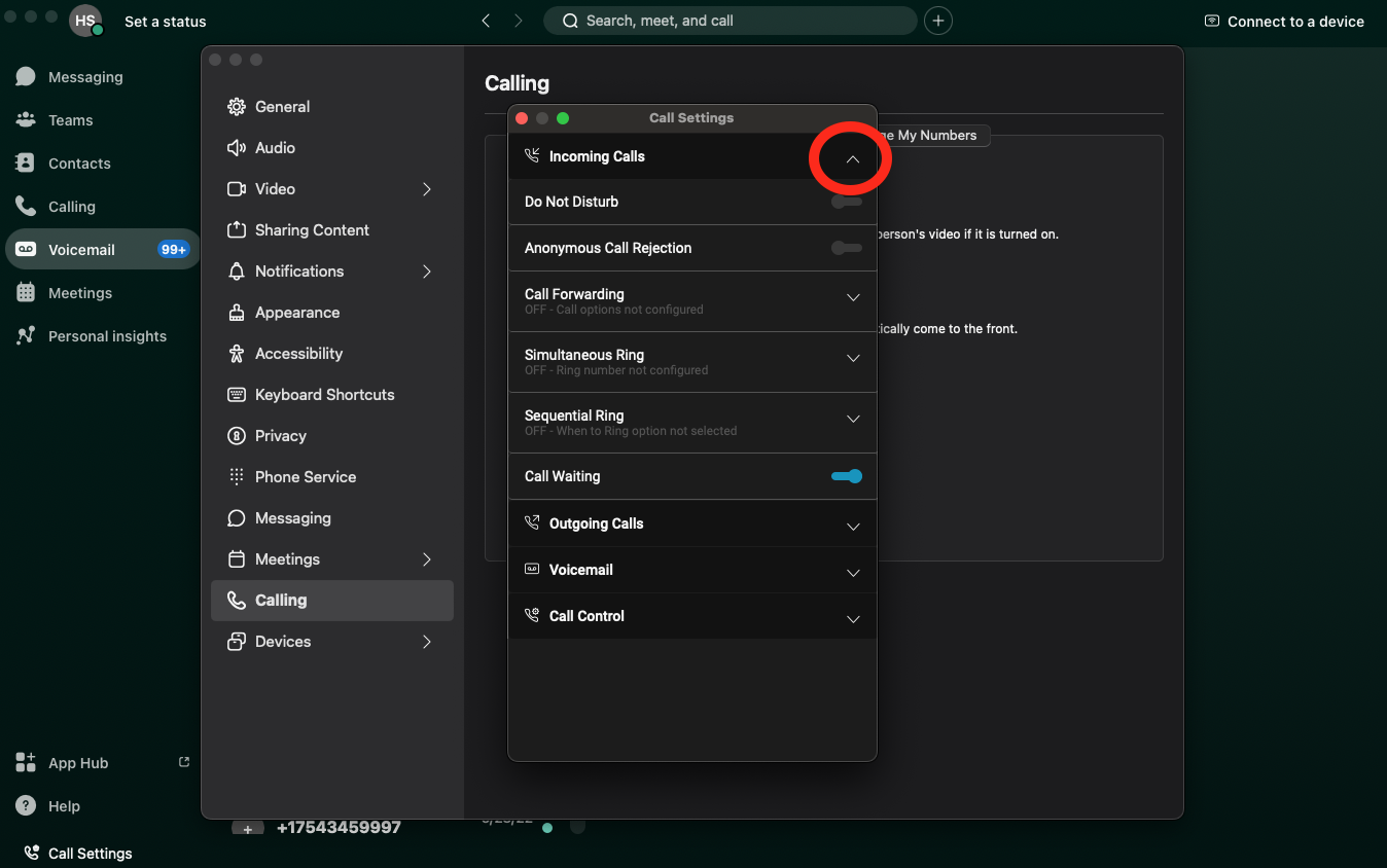 To access call settings, select call settings in the lower left corner, then choose Open Call Preferences.