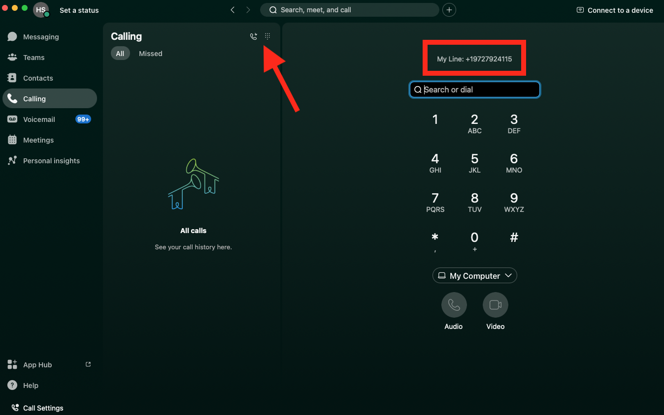 The calling menu provides access to the dialpad and call history. Your assigned phone number will be shown above the dialpad. Incoming calls will start ringing your Webex client once you login.