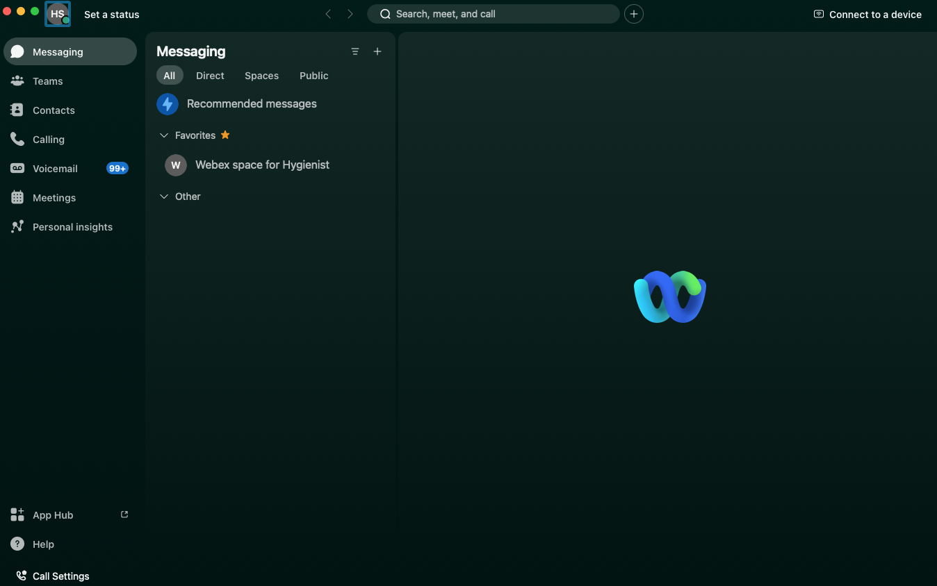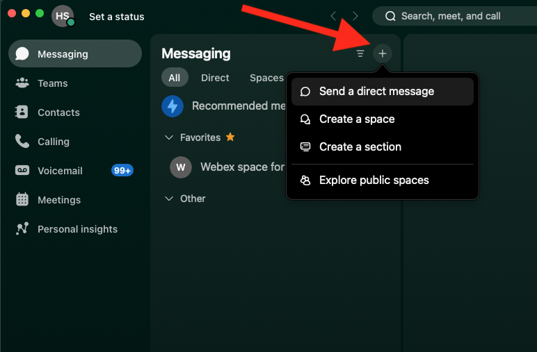 The messaging menu is where all chat communications occur and is typically the default page view when you login. You'll notice you have a Webex space already created for you that is your own personal playground to experiment with.