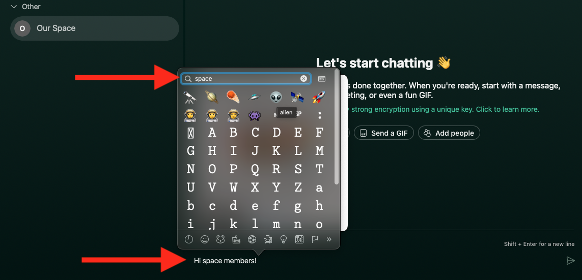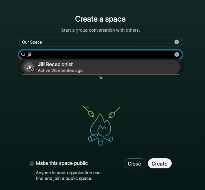 Once you've created the space, you'll see it in your list, and can start typing a message.
