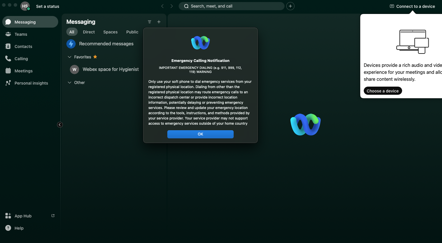 Click Sign In, then enter your username and password when prompted. On initial login, you'll see a couple pop ups on 911 calling and connecting to a Cisco Room OS device.