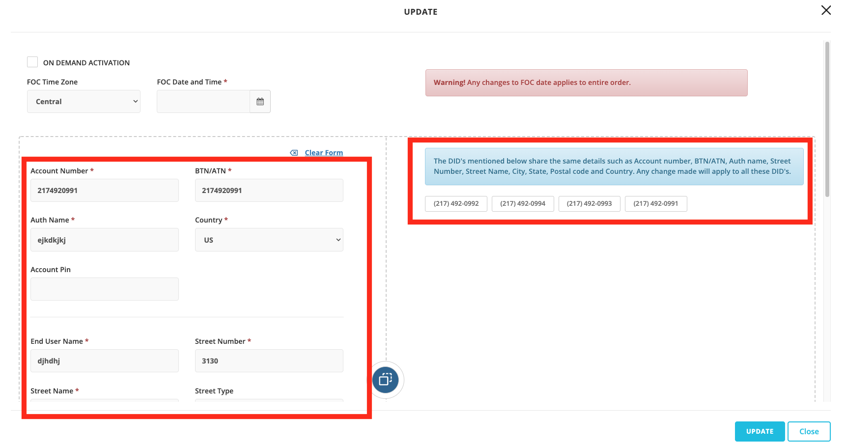 The Update screen will pull in any other numbers with the same matching account information and show the list on the right so you don't have to choose the numbers from a list now. The order information is automatically shown on the left. Make any necessary edits and then click Update at the bottom.
