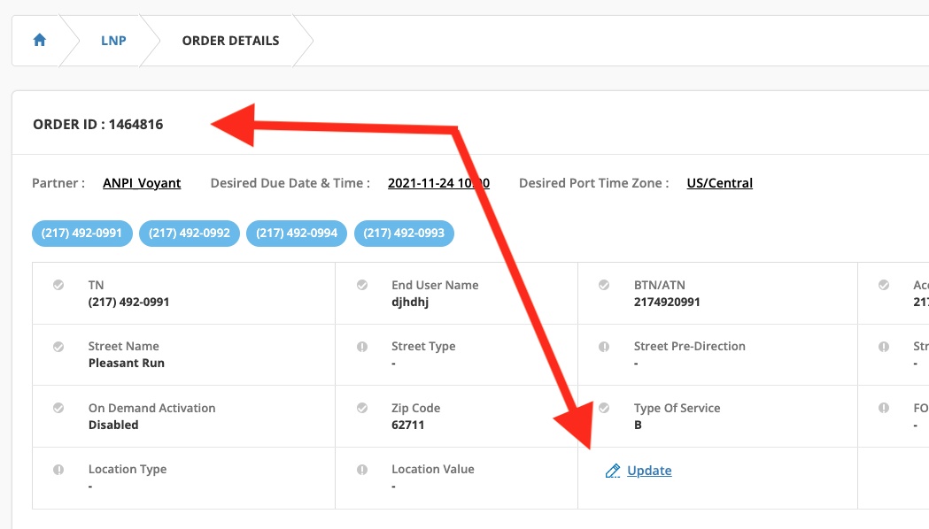 We just made LNP (Local Number Portability) Updates much easier! If a port order receives a rejection or you find information needs to be updated and resubmitted, you can now find the Update link in a new spot. Previously the Update link was found next to the Order ID. The Update link has now been moved within the specific number(s). Simply click one of the numbers that you need to update. Then click the Update link.