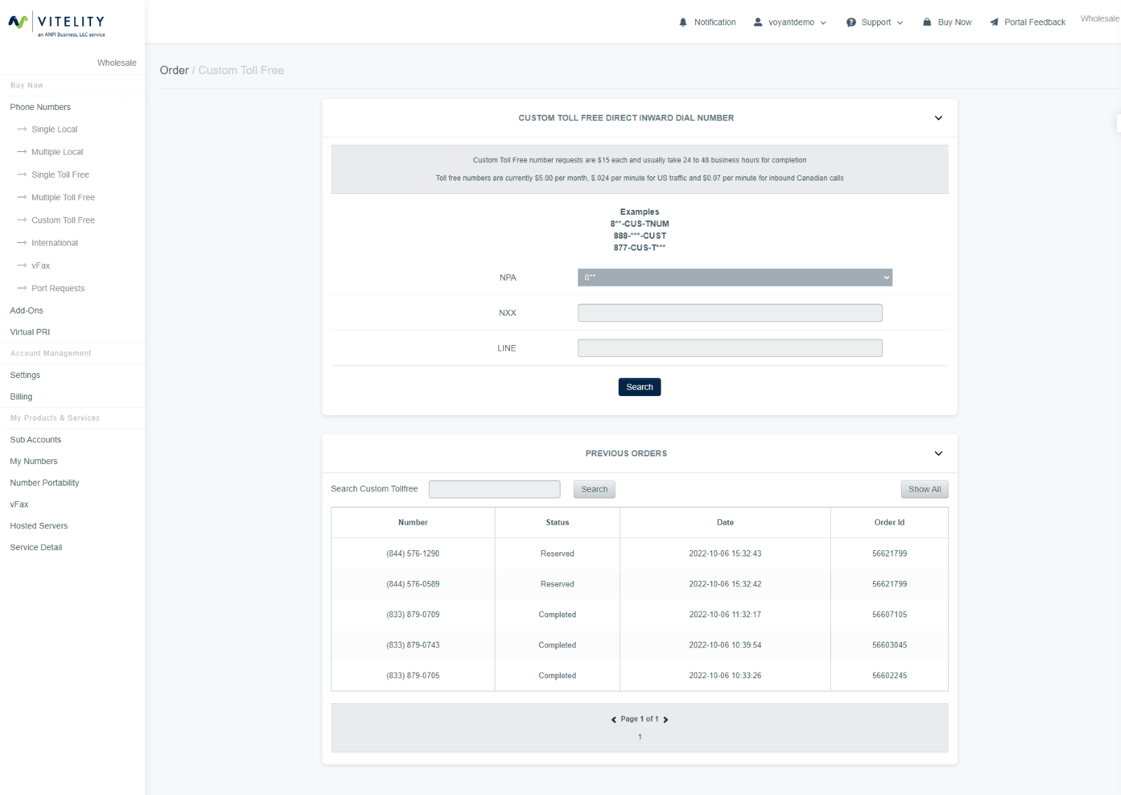 Customers can search for specific or broad toll-free numbers using the same various search criteria. What has changed on this screen is the ability to see orders placed. They are assigned order numbers and status of orders are provided.