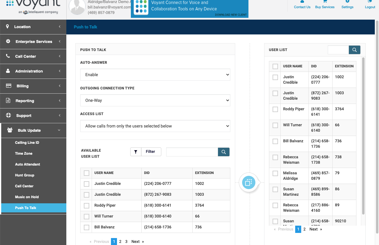 Push to Talk (PTT) is a feature enabled for certain devices within the Customer Administration Portal. It is device dependent - meaning that all of the devices in the PTT group must have that capability. Using the PTT feature is done with the device itself, typically through a menu or by using the *50 Feature Access Code. This article only talks about how to set up the feature in the Customer Admin Portal.