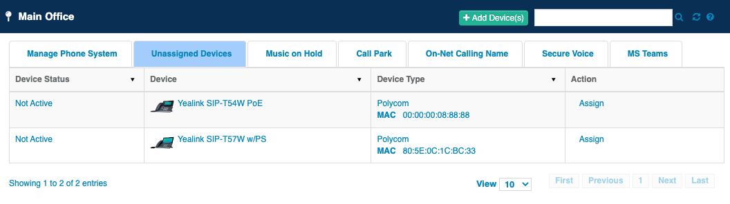 SIP devices such as phones and ATAs can be added to an existing enterprise to be associated to a seat at a later time.